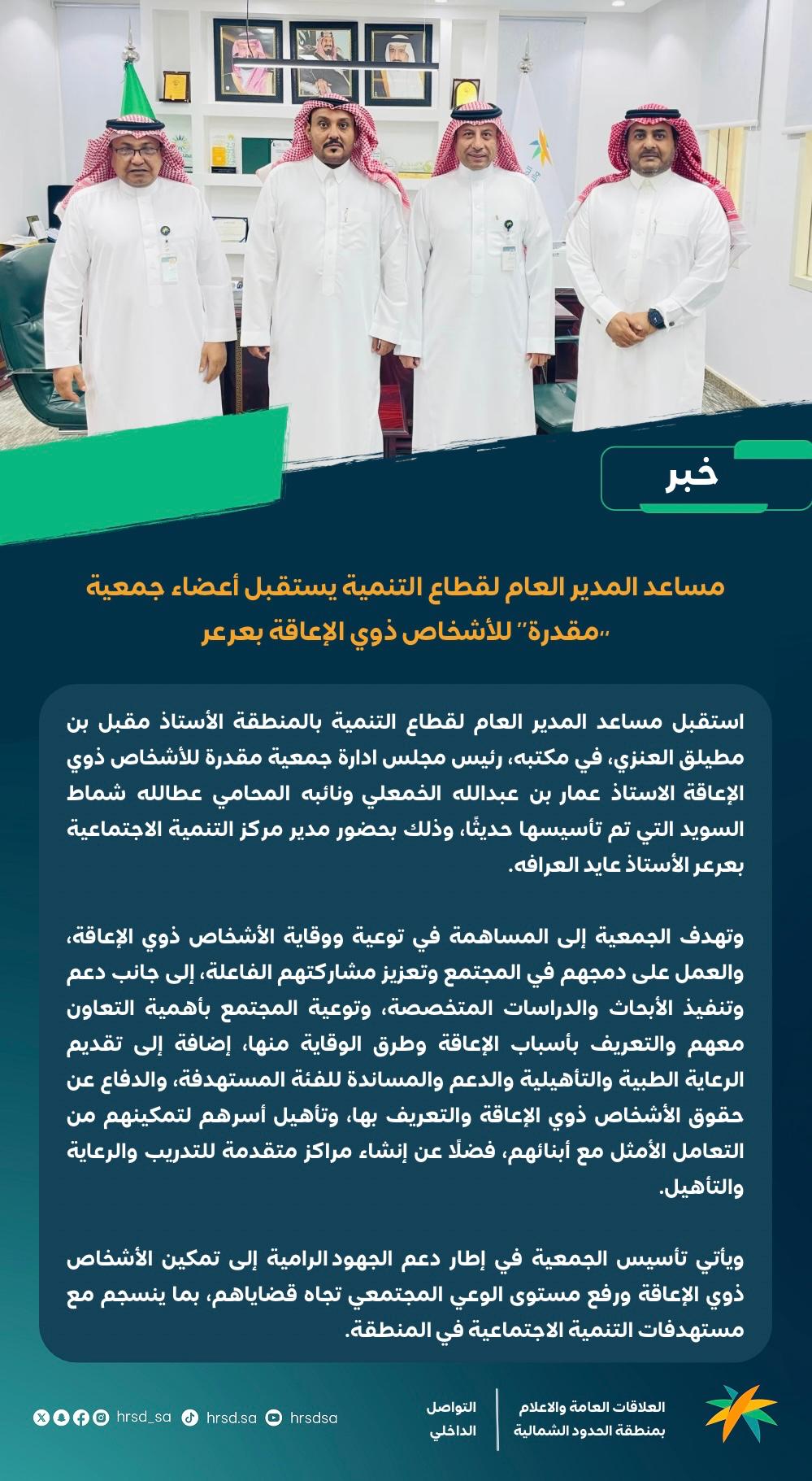 عرعر ٩ شعبان 1446 هـ الموافق 11 فبراير 2025 م تم بحمد الله تأسيس جمعية مقدّرة للأشخاص ذوي الإعاقة في مدينة عرعر، نسعى من خلالها إلى تمكينهم، ودعمهم، وخلق فرص تساهم في تحسين